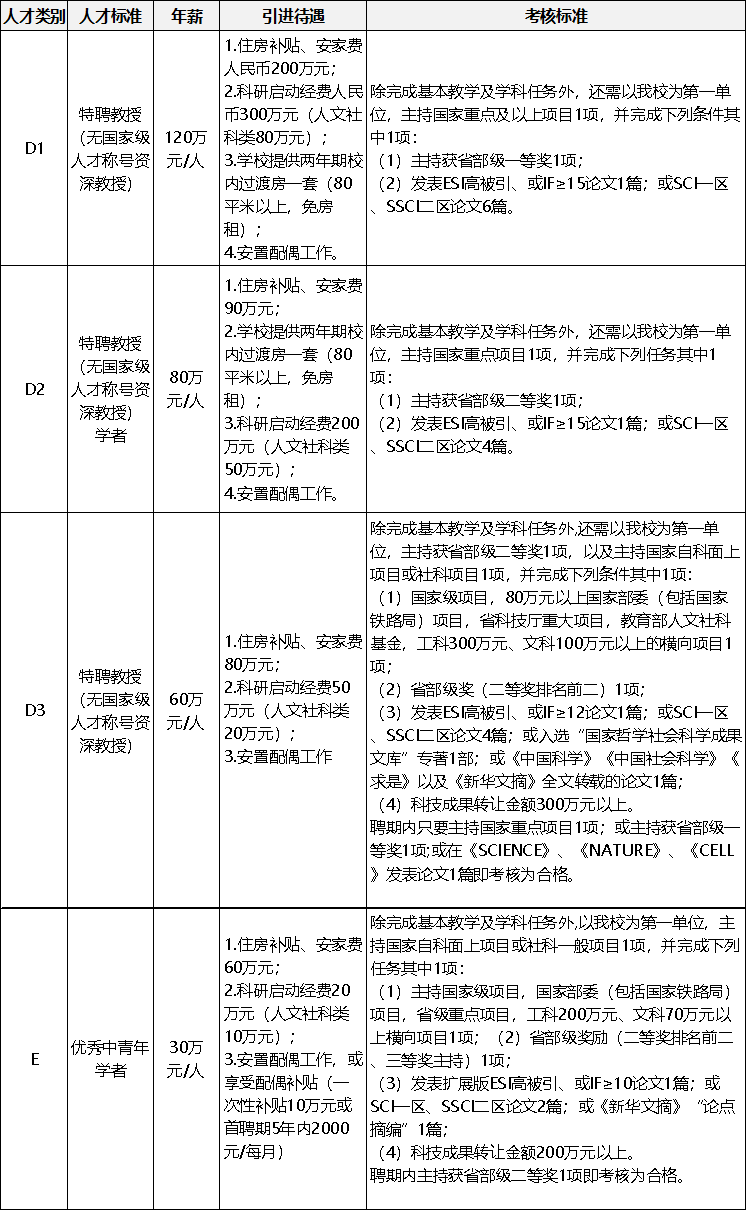 除了表中的D类(分D1、D2、D3)特聘教授和E类 优秀中青年学者,其他高层次人才待遇与条件面议。
