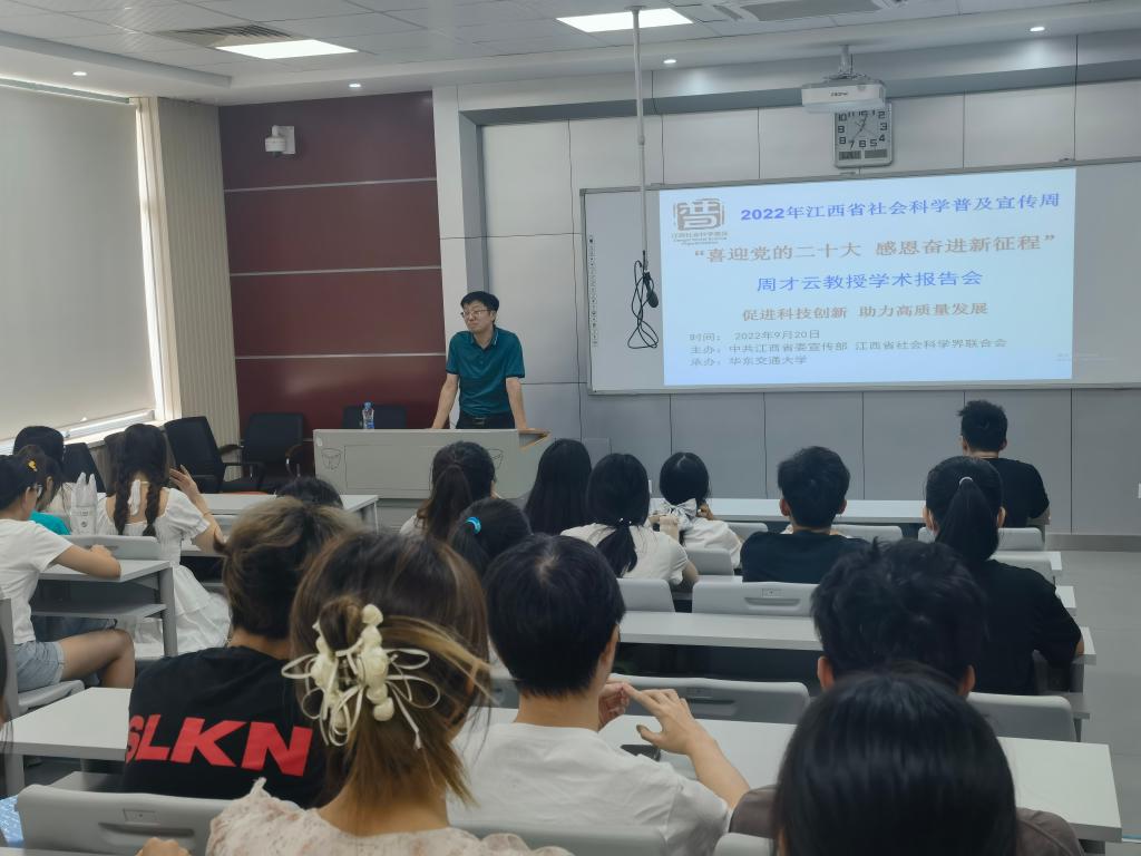 为迎接即将到来党的二十大,同时响应2022年江西省社会科学普及宣传周的号召,9月20日中午,我院周才云教授在31栋634教室举办了以“促进科技创新,助力高质量发展”为题的学术报告会。本次报告会由中共江西省委宣传部、江西省社会科学界联合会主办,yl7703永利集团承办,yl7703永利集团19级金融学和国际经济与贸易专业本科生参与本次报告会。