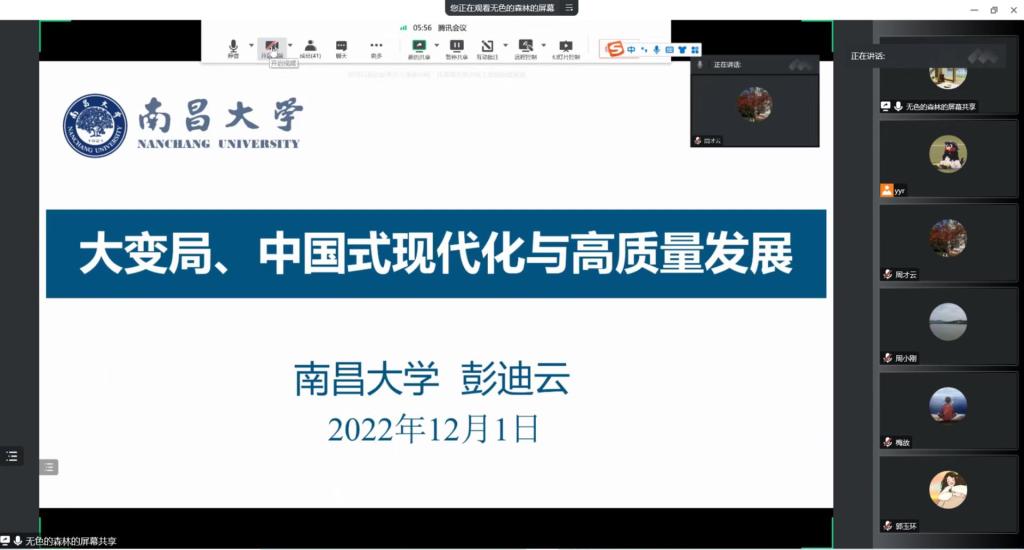 2022年12月1日晚,我院邀请南昌大学yl7703永利集团彭迪云教授进行了主题为“大变局、中国式现代化与高质量发展”的线上学术讲座,讲座由副院长周才云教授主持,近百名yl7703永利集团师生参与了本次学术讲座。