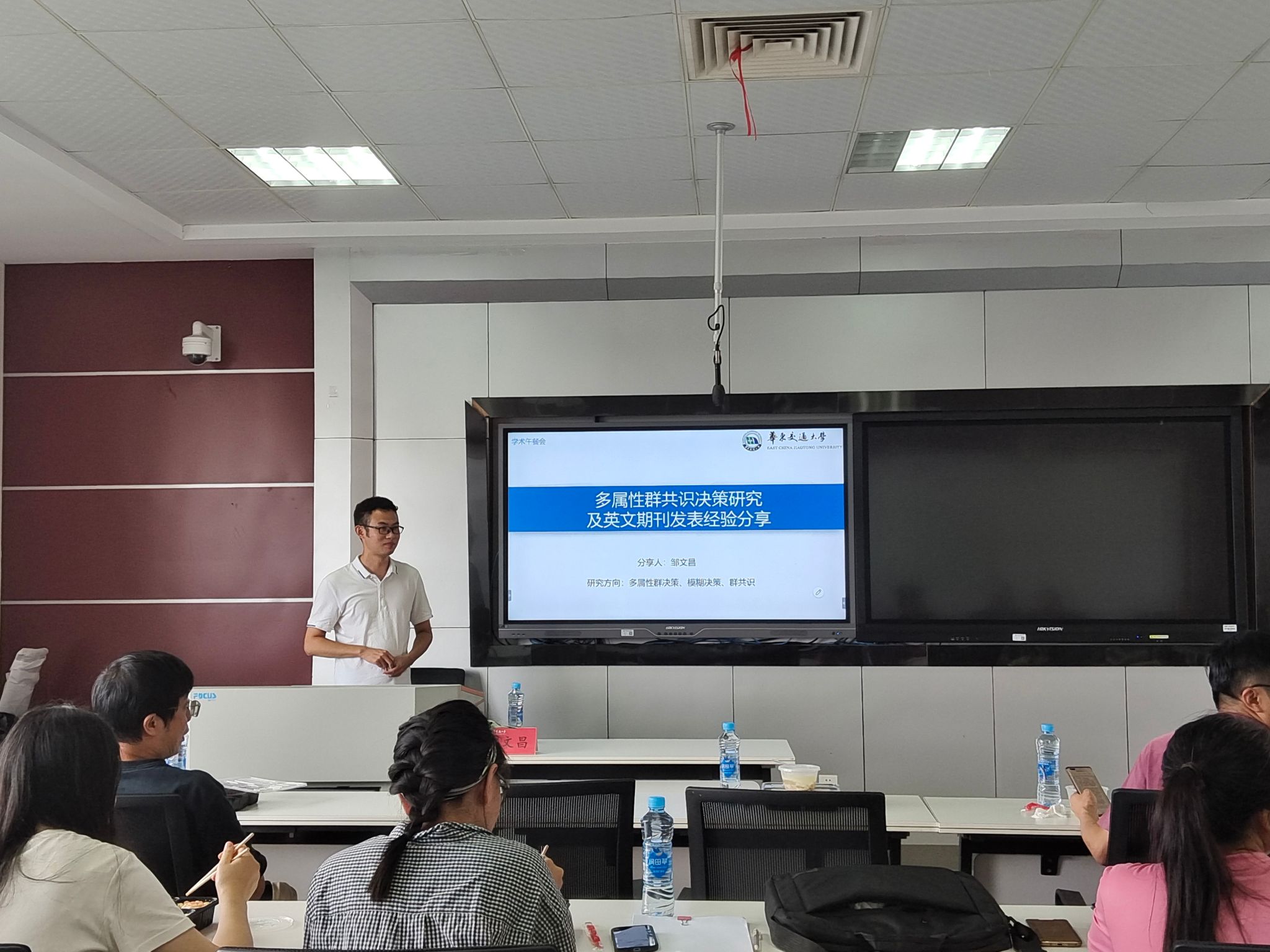 会上,邹文昌博士首先介绍了多属性群共识决策的相关研究,对多属性群决策、模糊决策和群共识进行了讲解,并以自己博士论文的主要章节为例,介绍了自身对于多属性群决策、群共识等方法的研究。随后,邹文昌博士对英文期刊发表经验进行了分享,从重要外文期刊的发展历程、外文期刊分区、外文期刊出版社、阅读文献来源期刊、期刊分区查询及文献下载五个方面对外文期刊进行介绍,并就自身的投稿经验对英文论文写作、投稿提出了实用的建议。