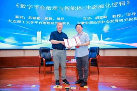 大连理工大学平台治理研究院院长苏敬勤教授围绕《数字平台治理与智能体—生态演化逻辑》主题,凭借深厚学术积淀与丰富研究经验,系统梳理数字平台治理脉络及智能体生态演化路径。安徽宏观经济社会发展研究院院长胡登峰教授与苏敬勤教授进行对话交流,进一步拓展学界对数字平台治理的认知边界。
