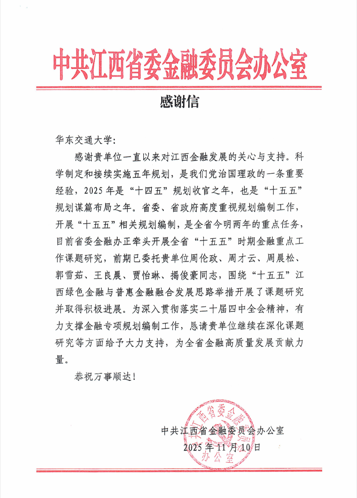 2025年11月10日,一封来自中共江西省委金融委员会办公室向我校发来感谢信,感谢我校一直以来对江西金融发展的关心与支持,并对我校在全省金融高质量发展中做出的贡献表示肯定。