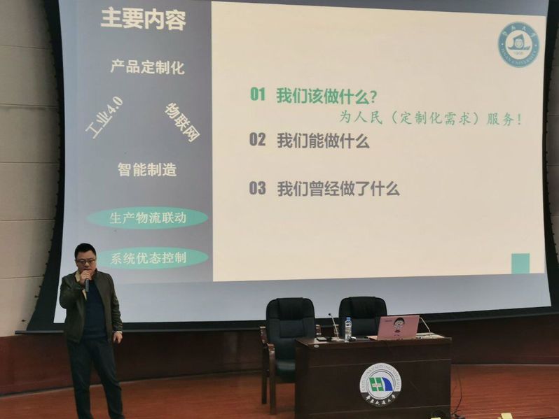 讲座伊始,屈挺教授先和同学们就工业4.0及其相关知识做了简短交流,他用形象生动的语言为大家介绍工业形态的发展过程,提出在面向工业4.0发展的大背景下,用科学的管理实现工业4.0生产是时代发展的大势所趋。接下来,屈教授从“面向工业4.0我们应该做什么?”这个问题出发为同学们进行讲解,他认为我们要做的就是为人民定制化需求服务,而这就要求我们对工业生产模式的管理进行创新性的全面变革,通过科学管理节省生产和物流时间为定制化产品大批量生产提供更大的可能。