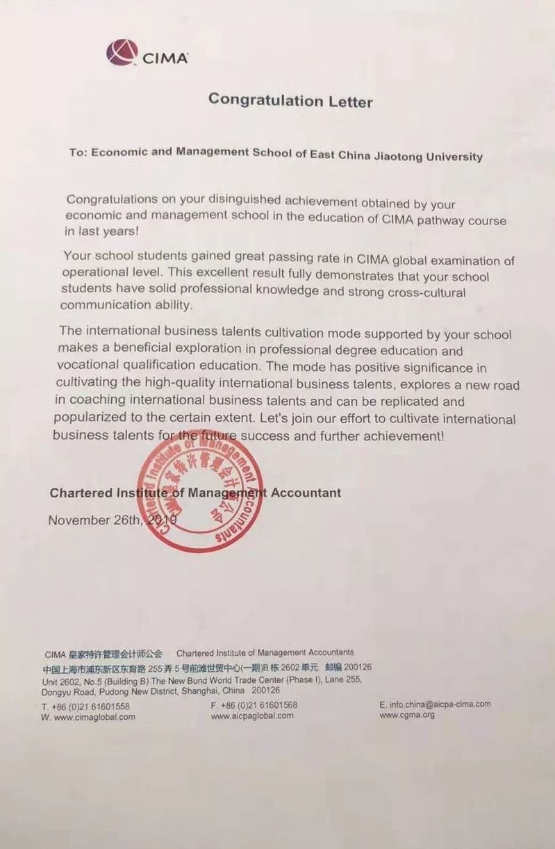CIMA方向班的尹依婷同学说,“此次荣誉的取得离不开老师们的细心指导,同学们的互帮互助,在此特别感谢老师们的用心栽培与学院的无私建设。”我院有着良好的学风与师风,在班级里,我们有着良好的学习风气,通过多方一齐努力,我专业有超半数同学通过CIMA基础级考试,通过率几近接近100%,随后相继通过运营级考试,通过率仍保持在90%以上!可见同学们的基础知识十分坚固,这离不开学院的比学赶超的优良学风、同学们的刻苦努力、更离不开老师与学院对学生的培养与支持。特此,CGMA公会发来诚挚的祝贺信,诚赞我院的教学质量,恭贺我校在运营级考试中取得的优异成绩。获此殊荣是对我校的教学充分的肯定和支持,也让我们更有信心、更受鼓舞地坚持专业发展与建设。
