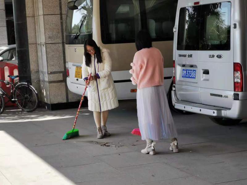 在班长的带领下,清扫工作有序开展。几把扫帚,扫出一方净土;几块抹布,擦净桌椅落灰。不仅如此,同学们还用手捡起草坪中的泡沫,纸屑和燃放烟花爆竹的残留物,一并送进了垃圾桶。经过同学们的辛苦打扫,31栋教学楼架空层休息区的面貌变得焕然一新。同时,国经的同学也热火朝天地在44、45栋寝室楼区域开展工作。他们不仅用扫帚和拖把认真清理了楼层,将楼下杂乱无序的自行车摆放整齐,更细心地劝导其他同学正确投放垃圾,充当站岗卫士。尽管工作量繁重,但他们任劳任怨,笑容始终洋溢在他们的面庞。当被提问到参加这次活动的感受时,同学们纷纷表示感触良多,最大的收获就是锻炼了家务能力,提升了集体荣誉意识。