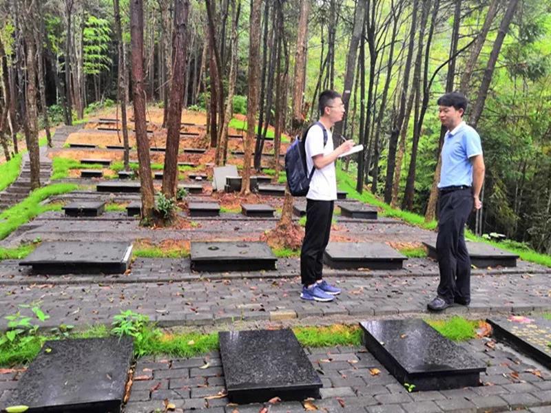 沿着山间公路而行,特色的生态墓地就隐藏在不起眼的小路深处,顺随砖红色蜿蜒而上,公墓分布在密布的丛林之中。株溪林场生态墓地建立于2018年,与乡村传统墓葬环境不同,生态墓地首先以公墓形式提倡乡村民众共同使用,以此取代传统较为随意的土葬形式。通过这样的方式,减少传统墓葬方式对土地大量分散的占用,节省出较大面积的土地作为耕地。据曾场长介绍,目前该生态墓地面向乡村民众实行极其优惠的政策,低负担墓葬一定程度上降低村民压力,也间接对生态墓地使用进行了推广。