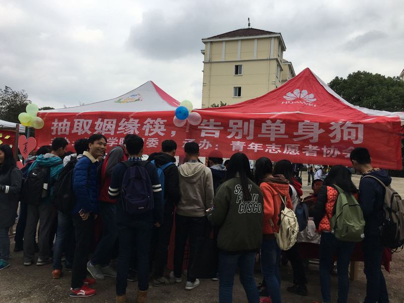 双十一怎么过?你要坚定的做一个“剁手党”么?11月10日,由经管学院团委主办,青年志愿者协会承办的双十一特别活动“抽取姻缘筷,告别单身狗”在北区一食堂前热闹举办。