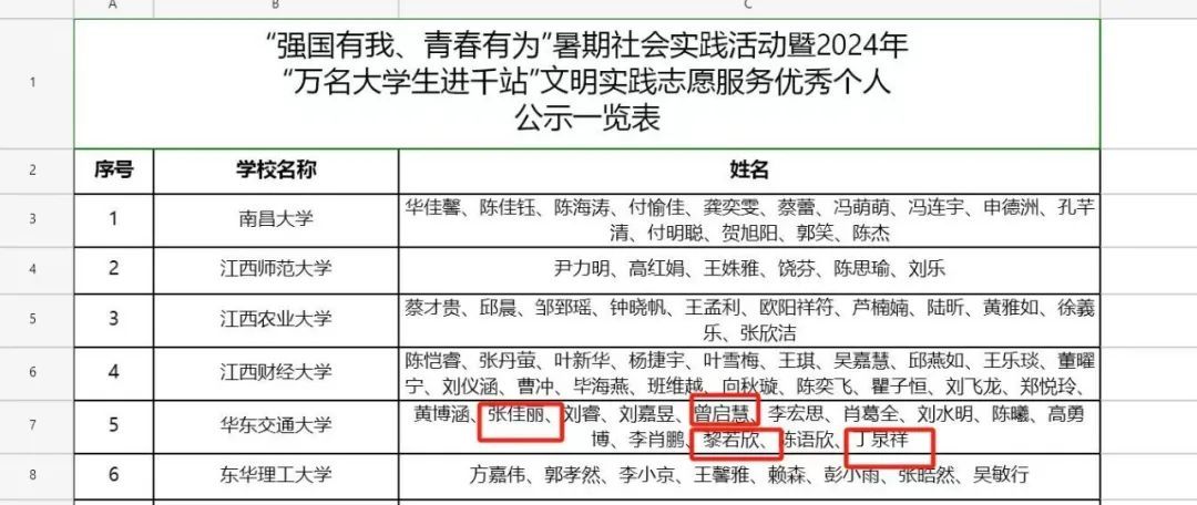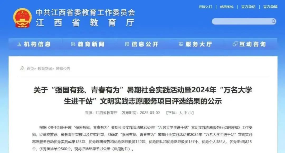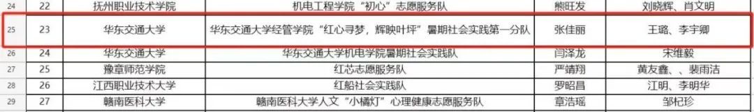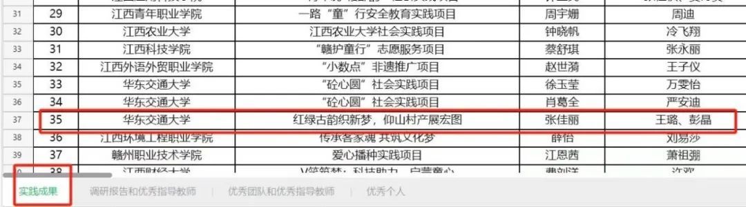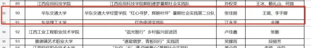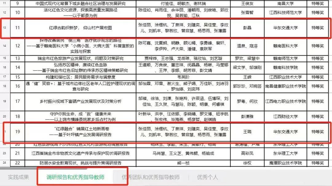 近日,江西省教育厅公示关于“强国有我、青春有为”暑期社会实践活动暨2024年“万名大学生进千站”文明实践志愿服务行动评审结果,我院喜获佳绩。其中斩获优秀实践成果一项、优秀调研报告和优秀指导老师特等奖两项、优秀团队和优秀指导老师两项。在彭晶、王璐、李宇卿等多位指导老师的带领下,“红心寻梦,辉映叶坪”暑期实践队的队员们,认真完成暑期实践任务,其中张佳丽、曾启慧、黎若欣、丁泉祥四位同学表现突出,荣获优秀个人荣誉称号。