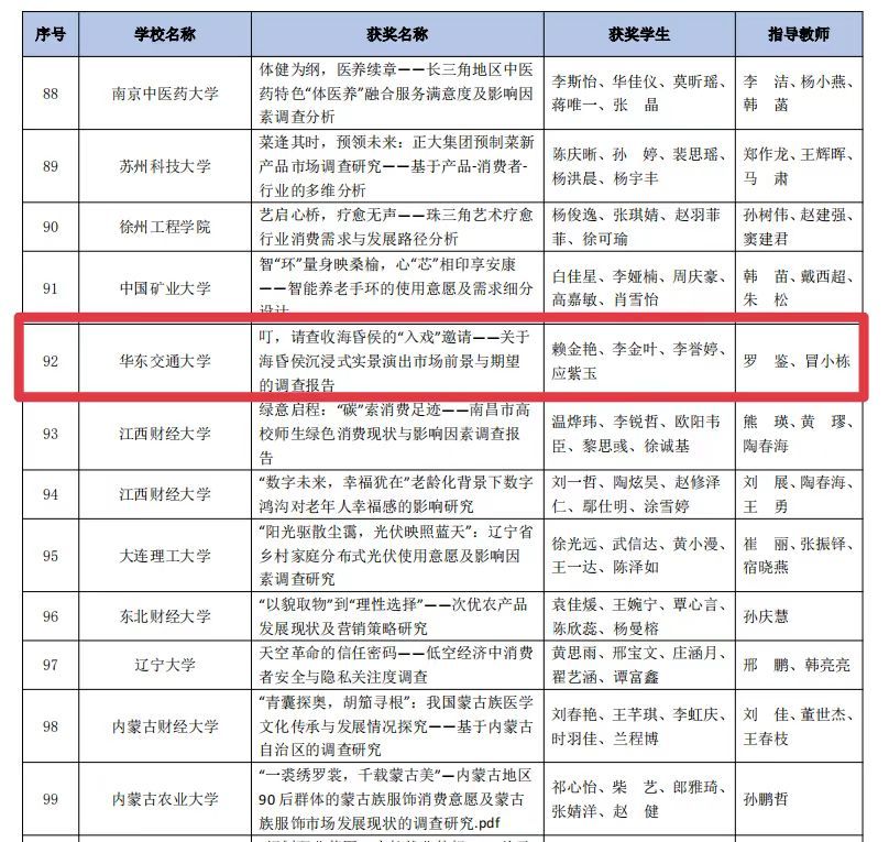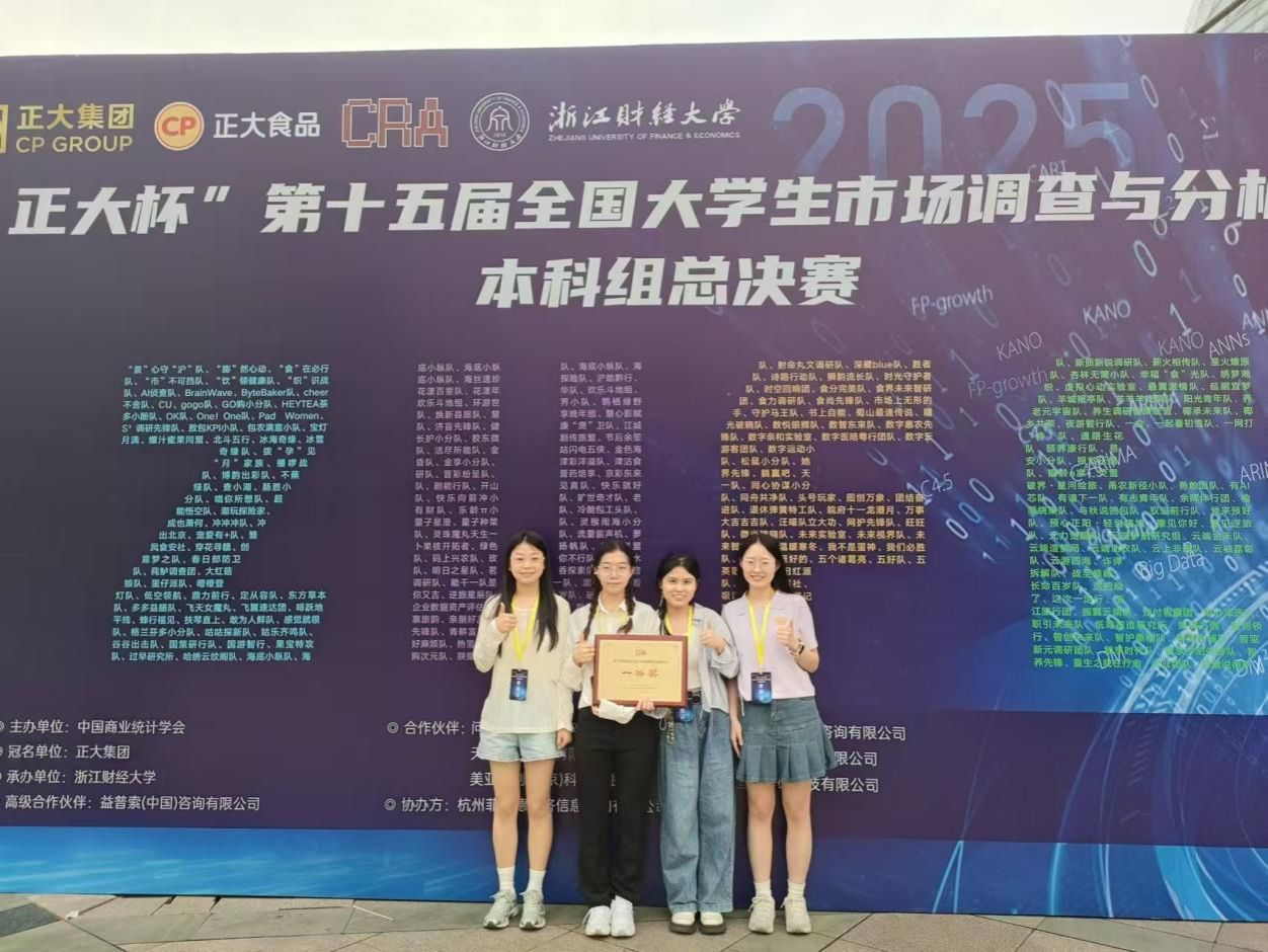 2025 年 5 月 24 日至 25 日,由中国商业统计学会、全国大学生市场调查与分析大赛组委会主办的“正大杯”第十五届全国大学生市场调查与分析大赛本科生组在浙江财经大学落下帷幕,我校学子获得本科生组全国一等奖1项,优秀指导教师1项。