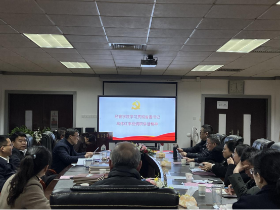 12月17日下午,经管学院在教31栋9楼会议室召开党委理论学习中心组(扩大)集中学习会,认真学习宣传贯彻省委书记易炼红到部分高校调研讲话精神。本次会议由党委书记王朗主持,学院党委委员、党支部书记参加。