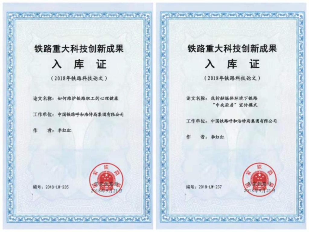 近年来,李红红精研宣传思想文化工作,不断提升专业素养和业务水平,参与研发“呼铁局党委宣传信息管理系统”并荣获全局科技进步优秀奖。目前正在研究互联网模式下新媒体平台发展的路径等工作。同时,刻苦钻研岗位工作技能和方法,每年结合实际撰写理论文章,截止目前,累计刊登专业论文17篇(其中国家级刊《现代商业》、《中国战略新兴产业》等刊登4篇),2篇论文收录“铁路重大科技创新成果”(2018年铁路科技论文),为提升铁路系统新闻宣传工作“软实力”做出了积极贡献。